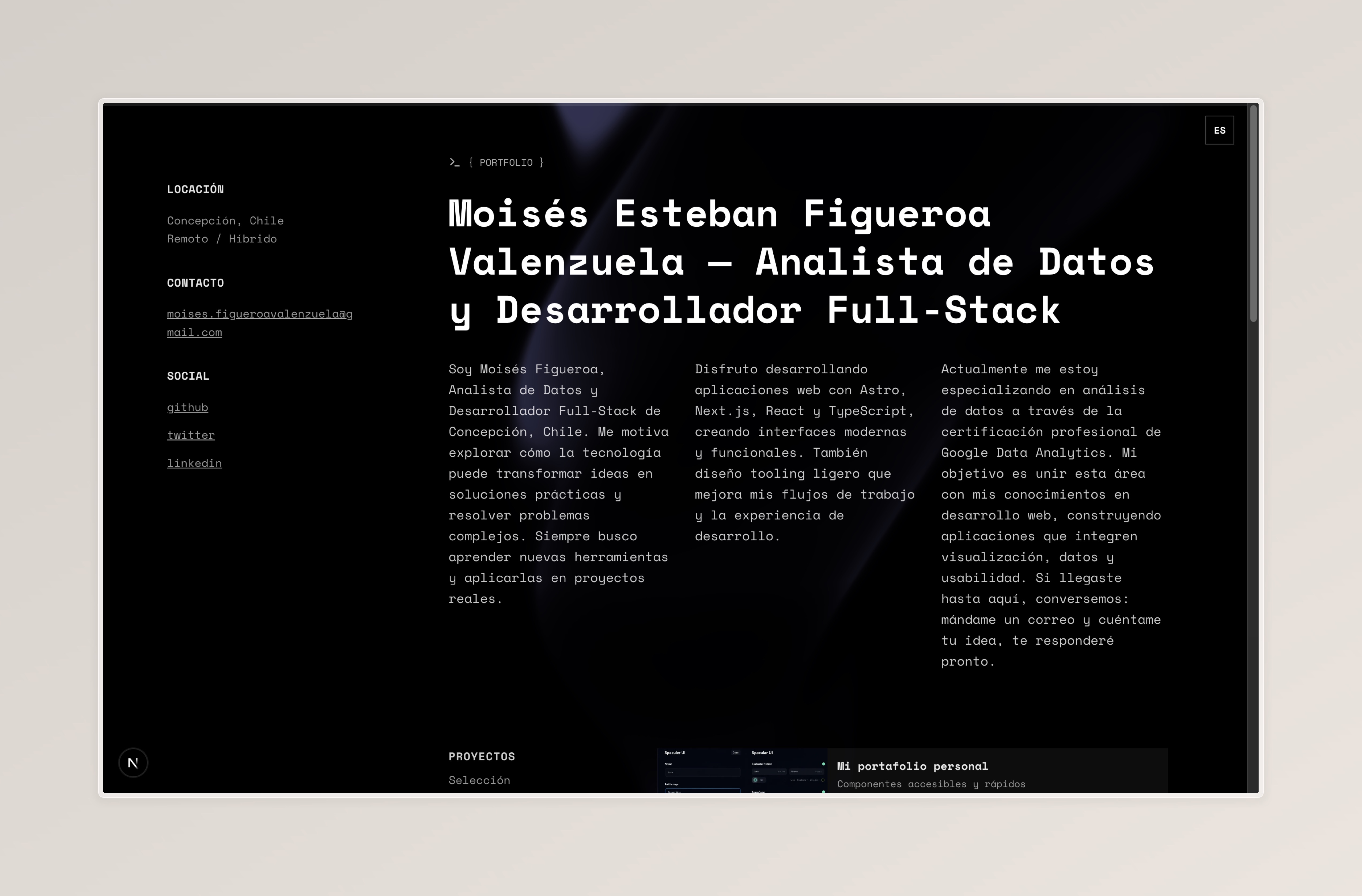 Un proyecto personal para centralizar y mostrar mi trabajo y habilidades en el desarrollo de software. El objetivo era crear una plataforma moderna, rápida y accesible donde pudiera documentar mi trayectoria profesional, proyectos destacados y experimentos técnicos. Este mismo sitio web es el resultado de ese esfuerzo, sirviendo como una carta de presentación interactiva y un espacio para compartir conocimientos a través de artículos de blog.